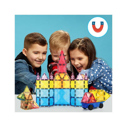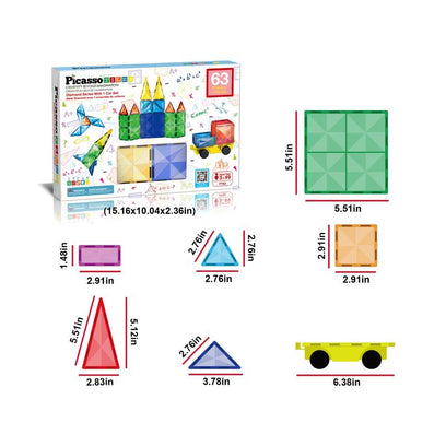 Los bloques de construcción magnéticos con superficie en diamante PicassoTiles de 63 piezas (SKU: PT63) ofrecen opciones para diseñar posibilidades creativas para los futuros ingenieros y arquitectos. Cada set viene con una base de vehículo, proporcionando una base estable para construir un vehículo tipo coche o camión de tiles magnéticos. Deja que la imaginación de tu hijo vuele mientras explora el mundo de la construcción magnética con PicassoTiles.